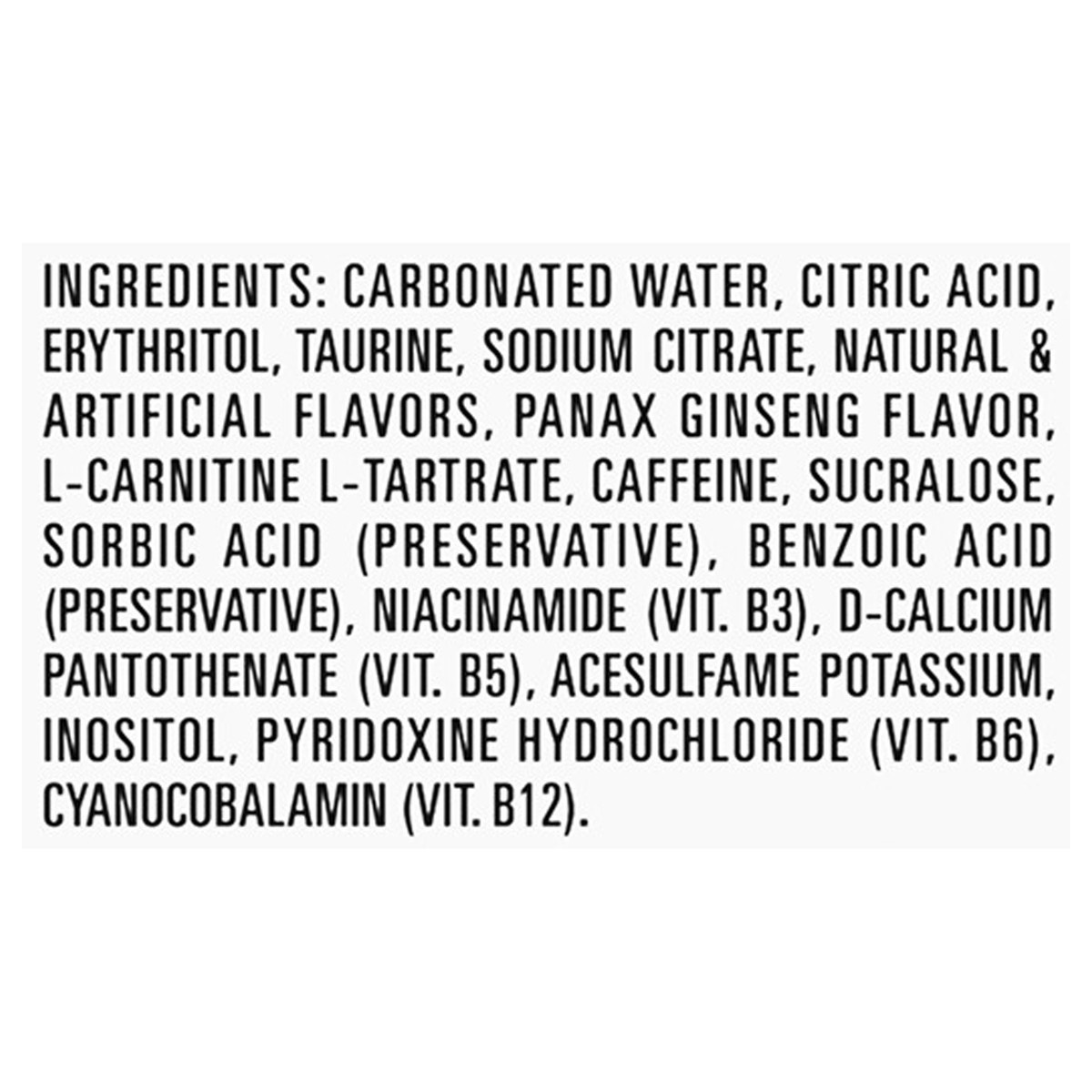 Carbonated Water, Citric Acid, Erythritol, Taurine, Sodium Citrate, Natural & Artificial Flavors, Panax Ginseng Flavor, L-Carnitine L-Tartrate, Caffeine, Sucralose, Sorbic Acid (Preservative), Benzoic…