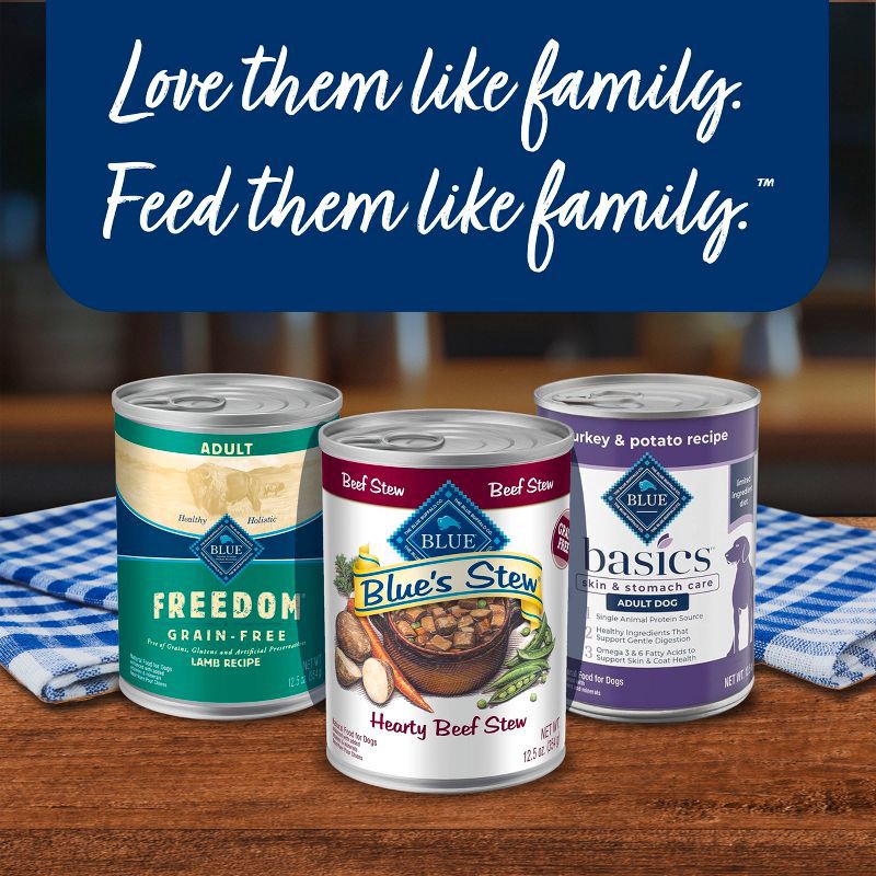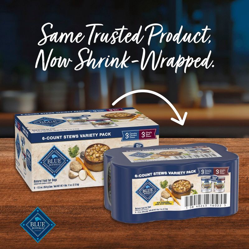 - PACKAGING MAY VARY: Contains three (3) 12.5-oz cans of Blue Buffalo Blue's Hearty Beef and three (3) 12.50oz cans of Blue Buffalo Blue's Country Chicken Stew Grain-Free Wet Dog Food