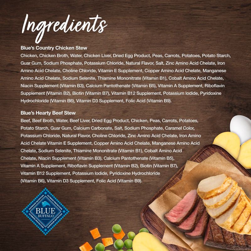 Blue's Country Chicken Stew: Chicken, Chicken Broth, Water, Chicken Liver, Dried Egg Product, Peas, Carrots, Potatoes, Potato Starch, Guar Gum, Sodium Phosphate, Potassium Chloride, Natural Flavor, Sa…