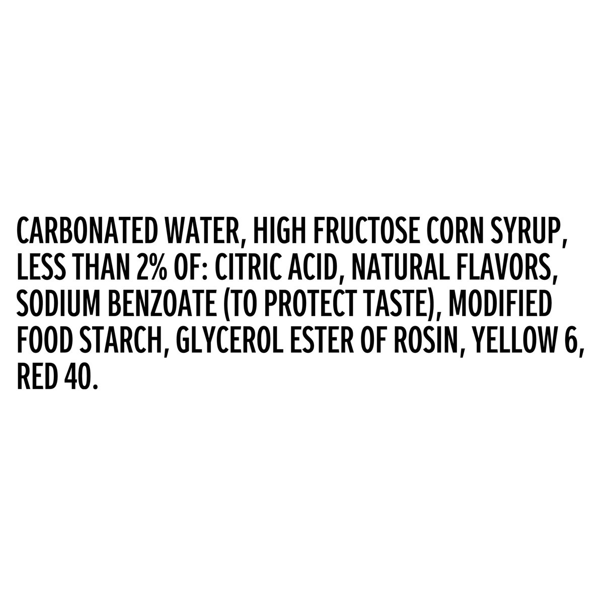 Carbonated Water, High Fructose Corn Syrup, Less than 2% of: Citric Acid, Natural Flavors, Sodium Benzoate (to Protect Taste), Modified Food Starch, Glycerol Ester of Rosin, Yellow 6, Red 40.