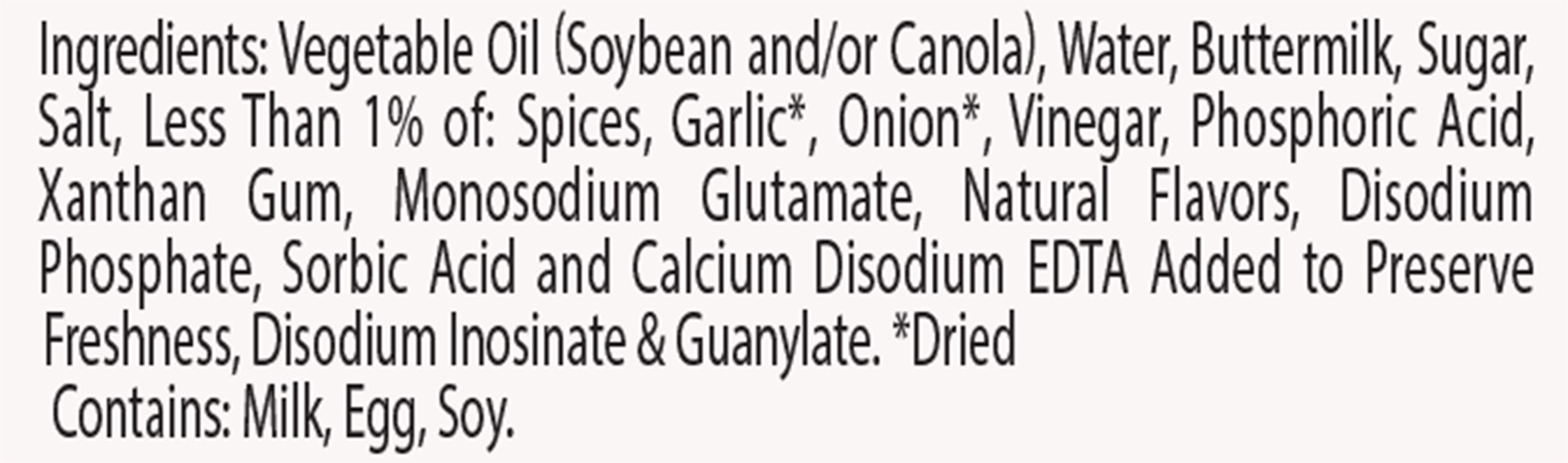 Ingredients: Vegetable Oil (Soybean and/or Canola), Water, Buttermilk, Sugar, Salt, Less Than 1% of: Spices, Garlic*, Onion*, Vinegar, Phosphoric Acid, Xanthan Gum, Monosodium Glutamate, Natural Flavo…