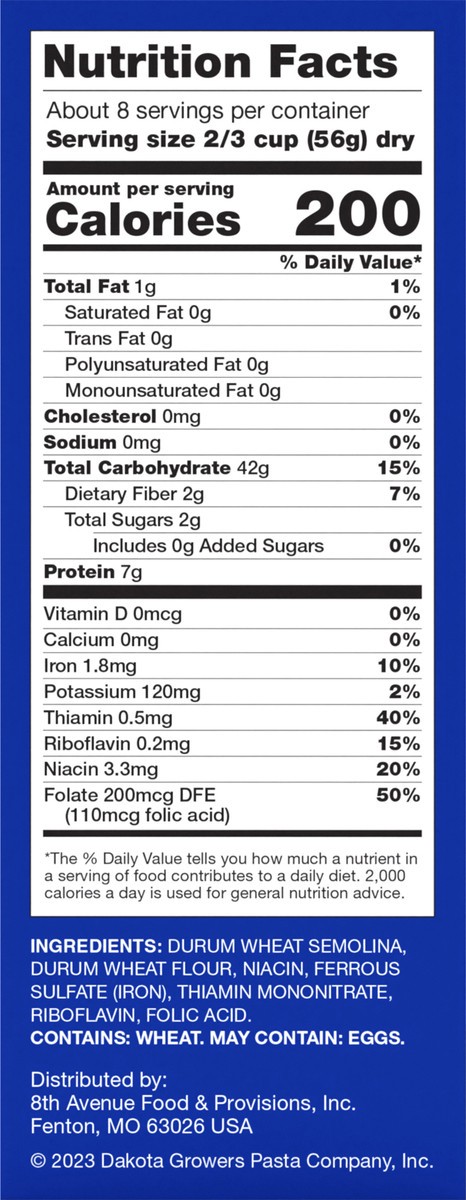 Durum Wheat Semolina, Durum Wheat Flour, Niacin, Ferrous Sulfate (Iron), Thiamin Mononitrate, Riboflavin, Folic Acid.