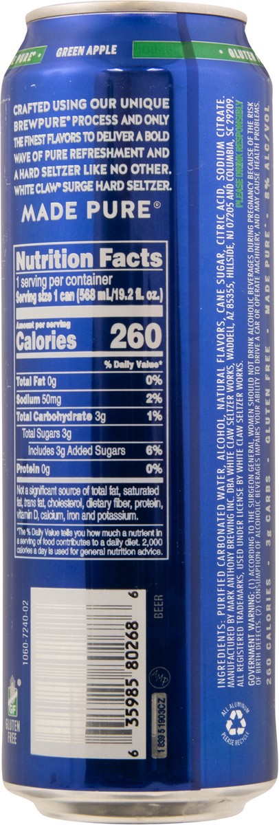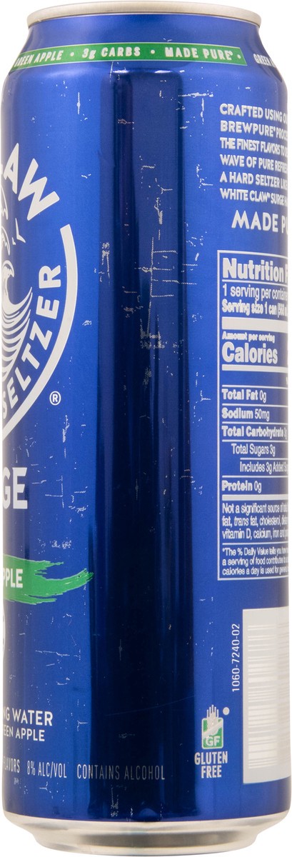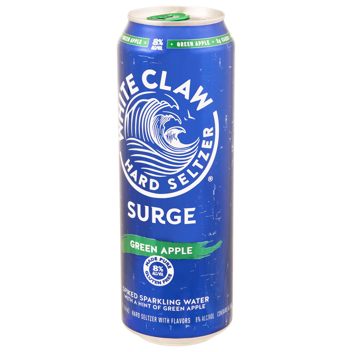 At 8% alcohol, discover a stronger wave of taste refreshment with White Claw Hard Seltzer Surge Green Apple Crafted with quality ingredients, White Claw Hard Seltzer Surge Green Apple is made from a b…