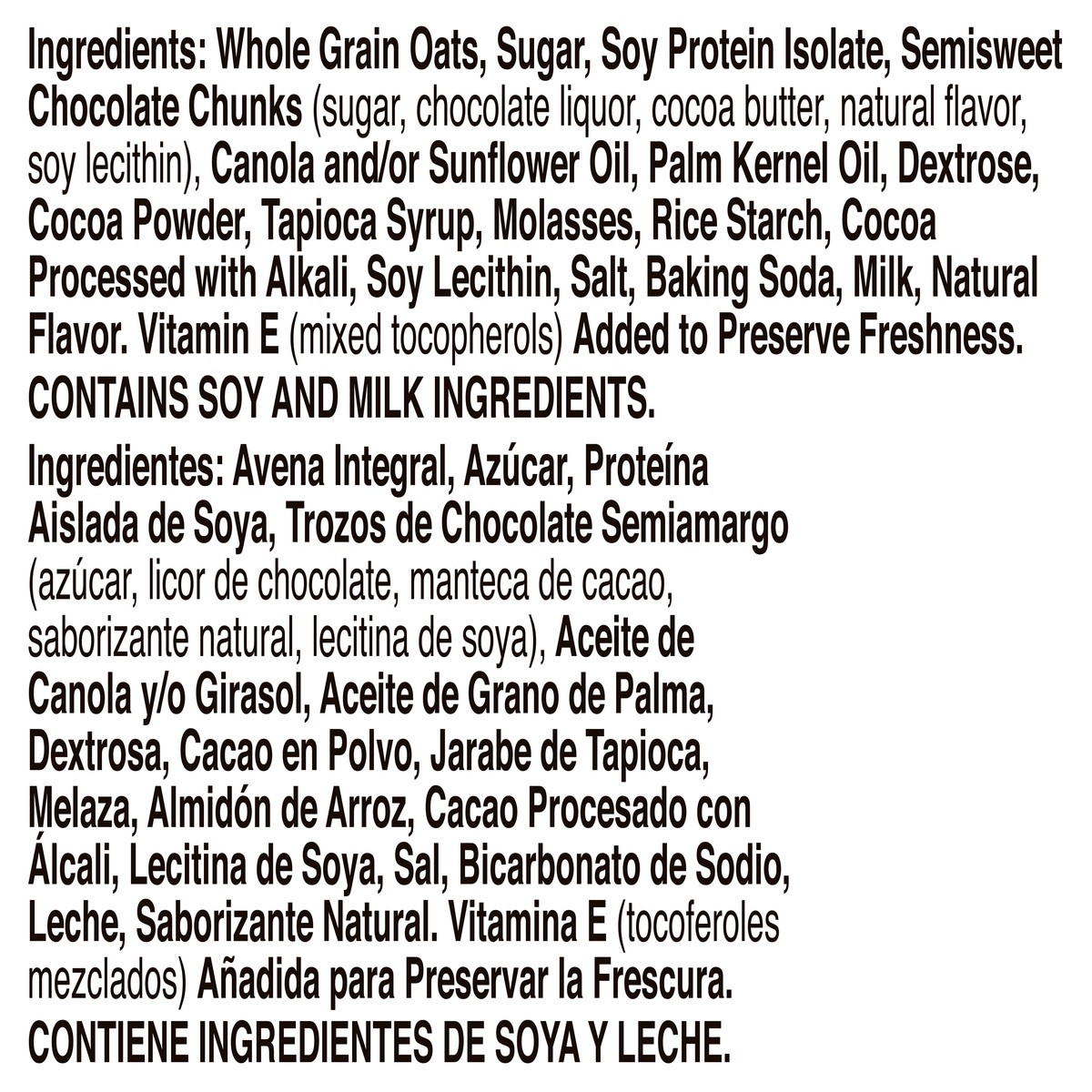 Whole Grain Oats, Sugar, Soy Protein Isolate, Semisweet Chocolate Chunks (Sugar, Chocolate Liquor, Cocoa Butter, Natural Flavor, Soy Lecithin), Canola and/or Sunflower Oil, Palm Kernel Oil, Dextrose, …