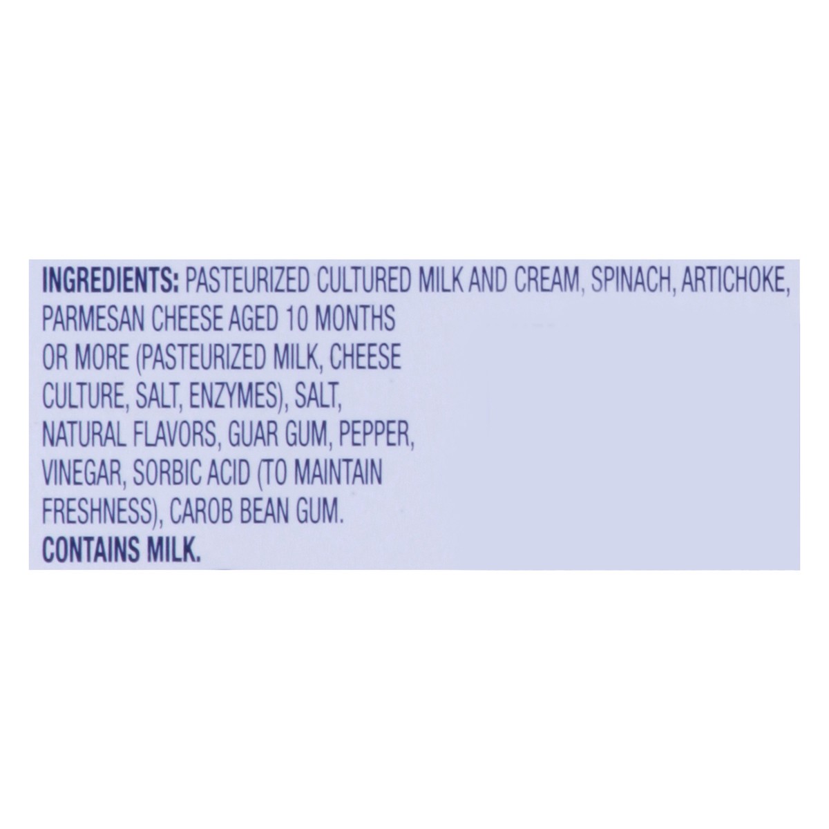 Pasteurized Cultured Milk and Cream, Spinach, Artichoke, Parmesan Cheese Aged 10 Months or More (Pasteurized Milk, Cheese Culture, Salt, Enzymes), Salt, Natural Flavors, Guar Gum, Pepper, Vinegar, Sor…