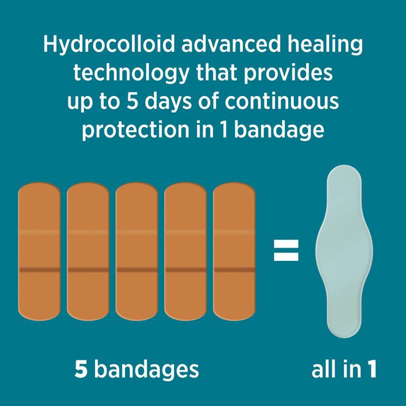 - Hydrocolloid advanced healing technology provides up to 5 days of continuous protection in 1 bandage