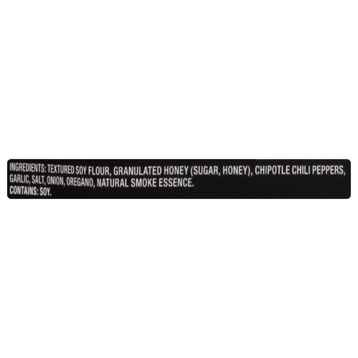 Textured Soy Flour, Granulated Honey (Sugar, Honey), Chipotle Chili Peppers, Garlic, Salt, Onion, Oregano, Natural Smoke Essence.