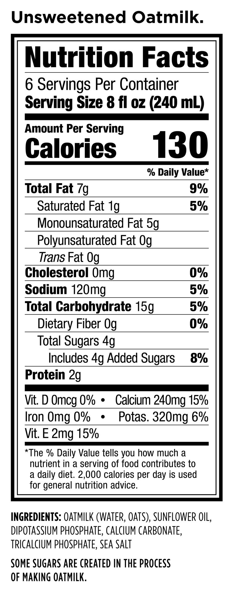 Oatmilk (Water, Oats), Sunflower Oil, Dipotassium Phosphate, Calcium Carbonate, Tricalcium Phosphate, Sea Salt, Vitamin A Palmitate, Vitamin D2