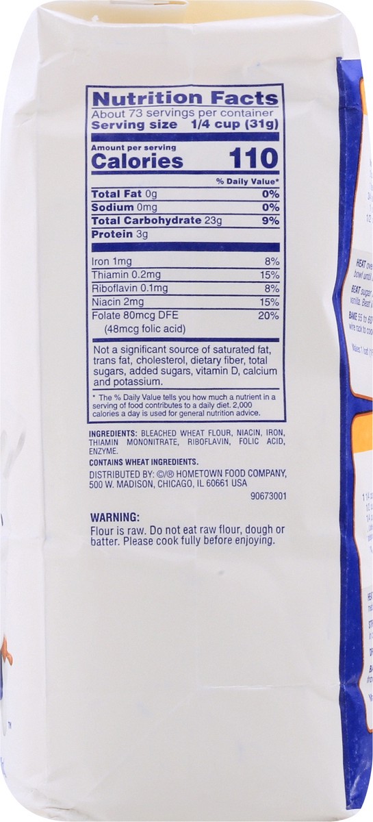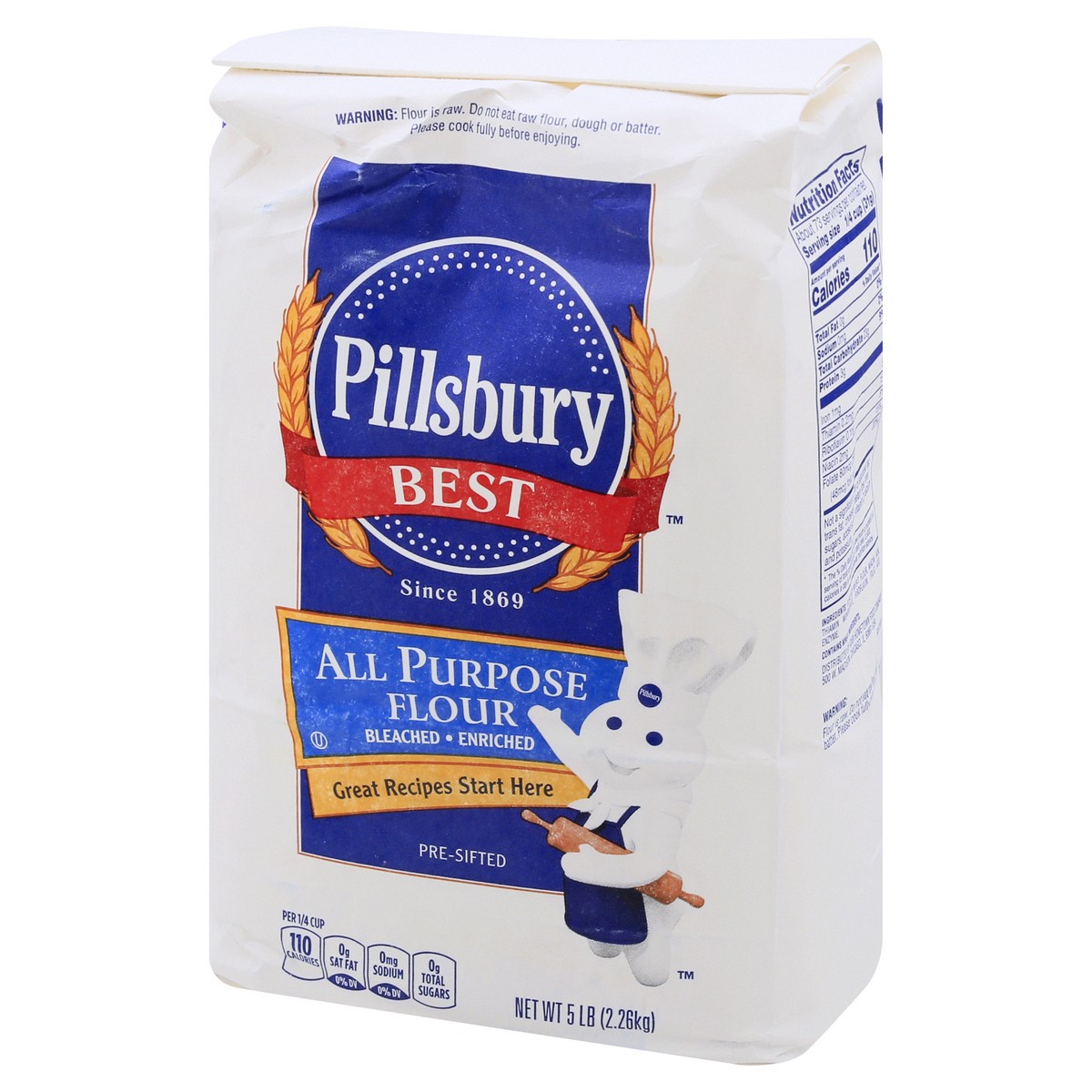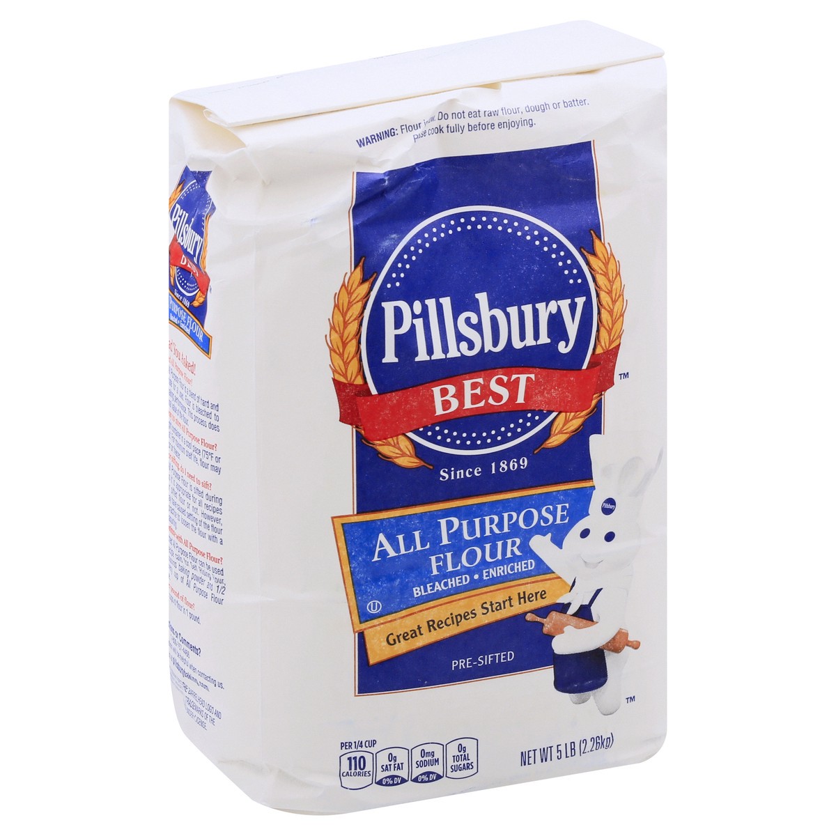 Per 1/4 Cup: 110 calories; 0 g sat fat (0% DV); 0 mg sodium (0% DV); 0 g total sugars. Since 1869. Bleached. Enriched. Great recipes start here. Pre-sifted. Glad you asked! What is Bleached All Purpos…