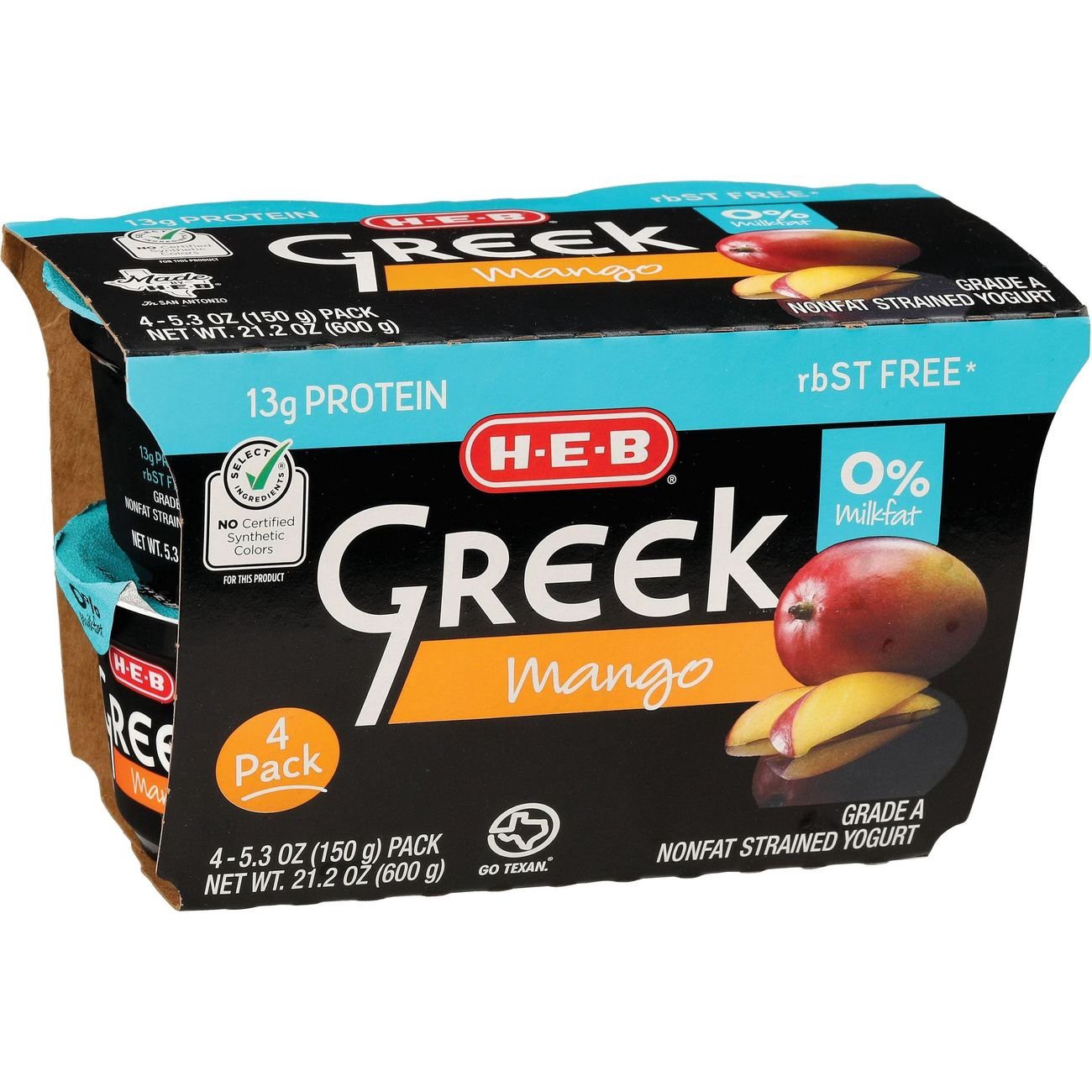 H-E-B Greek Yogurt - Blended Mango: Strained Yogurt (Cultured Pasteurized Grade A Fat Free Milk), Mangos, Sugar, Water, Corn Starch, Natural Flavor, Lemon Juice Concentrate, Annatto (Color), Natamycin…
