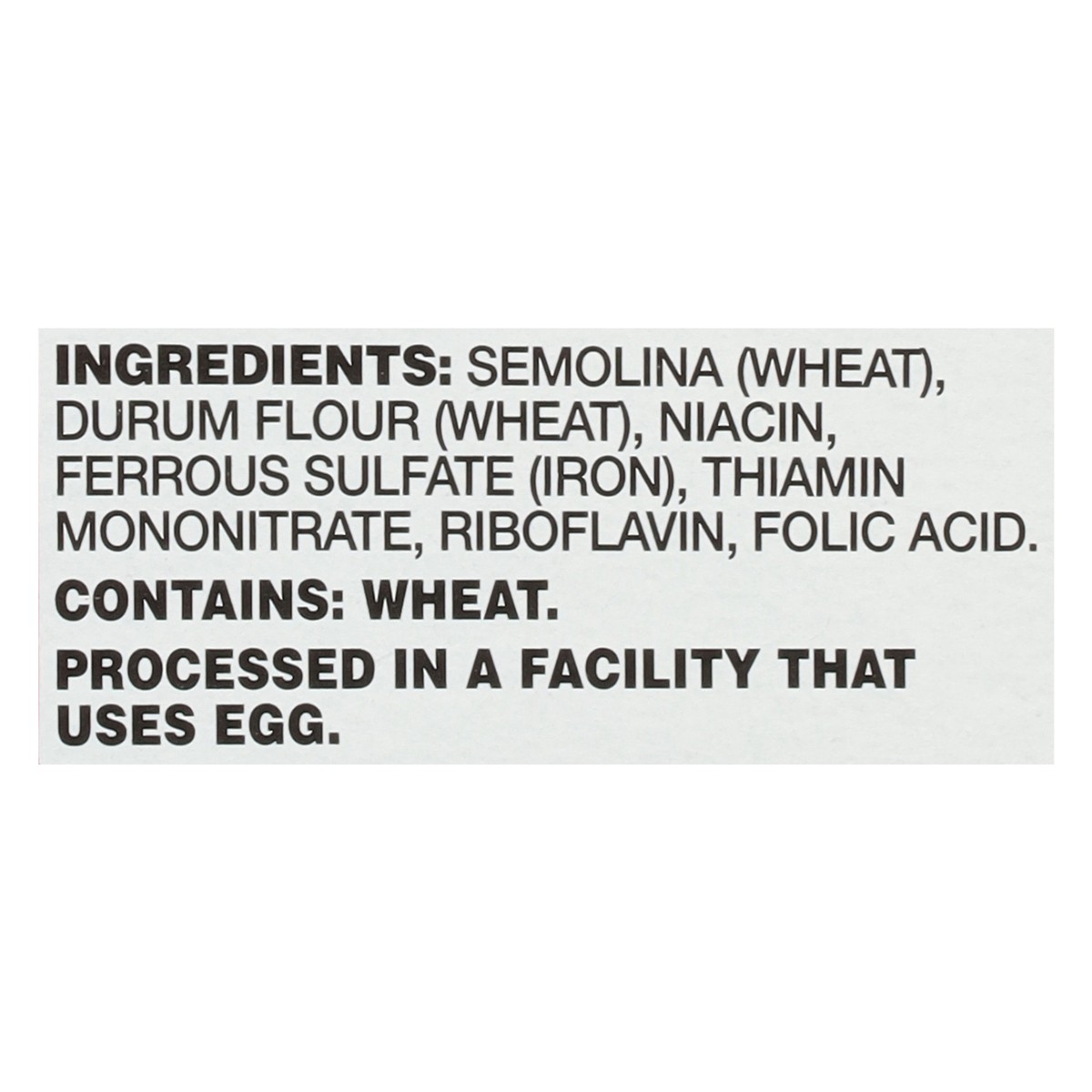 Semolina (Wheat), Durum Flour (Wheat), Niacin, Ferrous Sulfate (Iron), Thiamin Mononitrate, Riboflavin, Folic Acid.