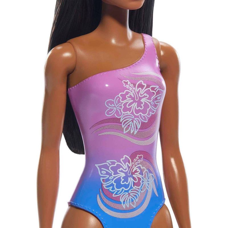 - This Barbie doll wears a molded one-shoulder swimsuit with a purple color palette and tropical design