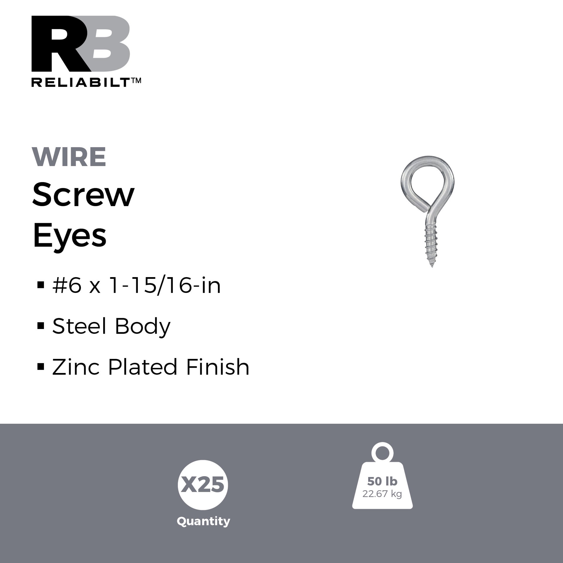 25-count #6, 1-15/16-in screw eyes are used to attach an eye to a structure, through which rope, cable or shackles can be secured. Manufactured from steel wire for superior durability. Sharp screw poi…