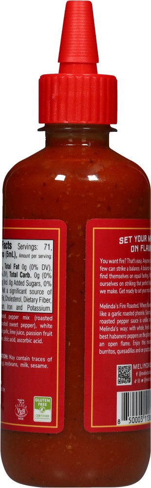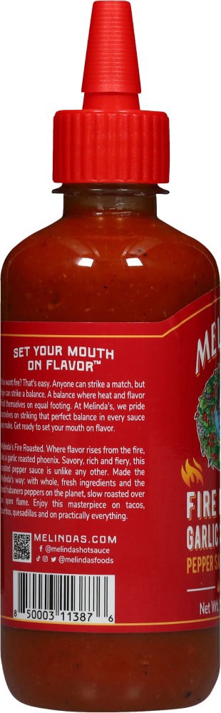 Melinda's Fire Roasted. Where flavor rises from the fire, like a garlic roasted phoenix. Savory, rich and fiery, this roasted pepper sauce is unlike any other. Made the Melinda's way: with whole, fres…