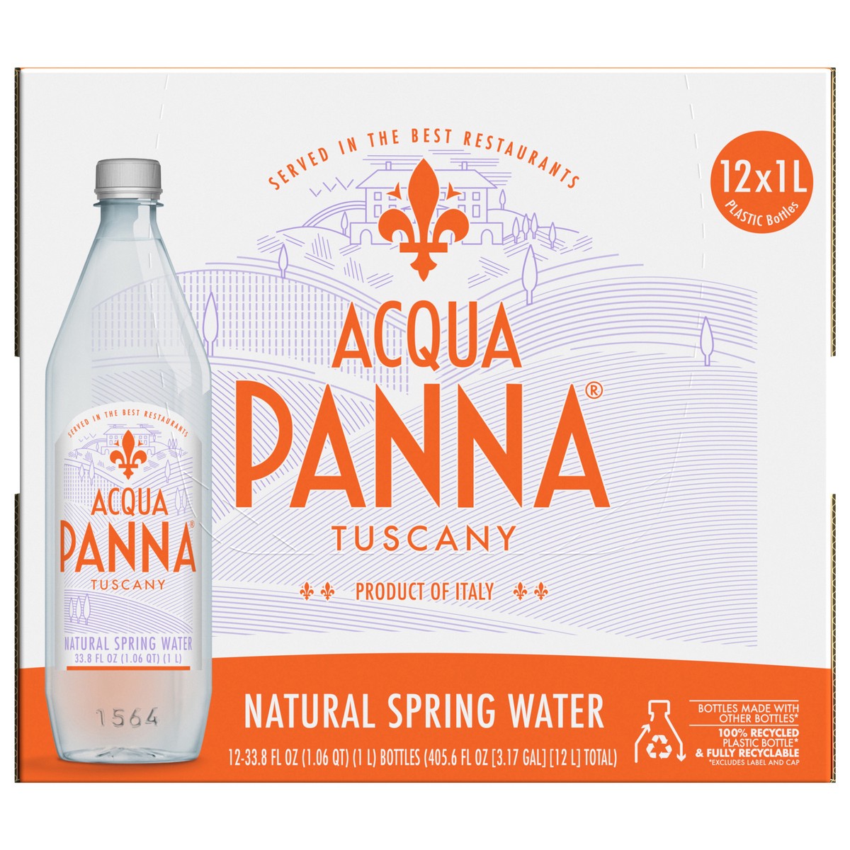 - Twelve 33.8 fl oz/1 L plastic bottles of Acqua Panna Natural Spring Water