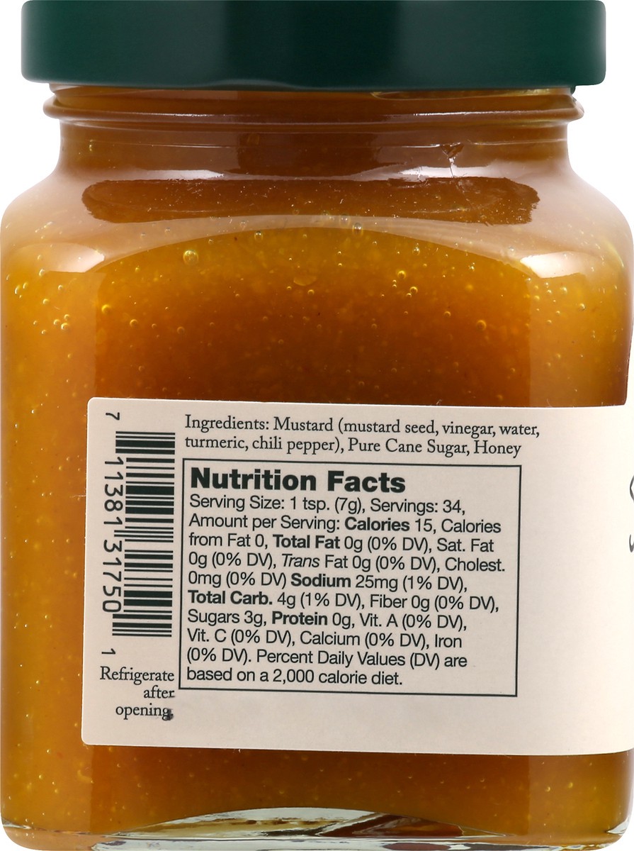 Mustard (Mustard Seed, Vinegar, Water, Turmeric, Chili Pepper), Pure Cane Sugar, Honey.