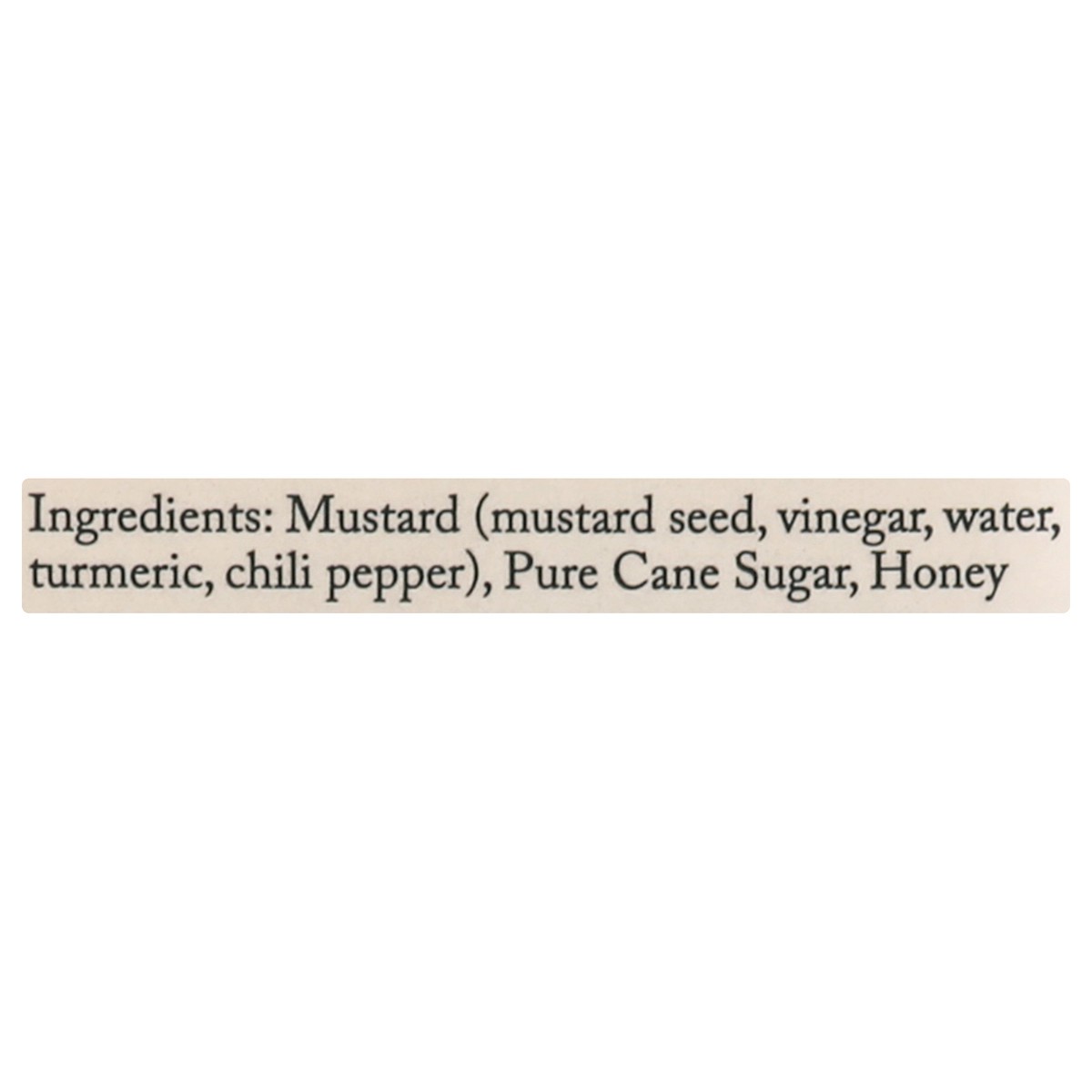 Mustard (Mustard Seed, Vinegar, Water, Turmeric, Chili Pepper), Pure Cane Sugar, Honey.