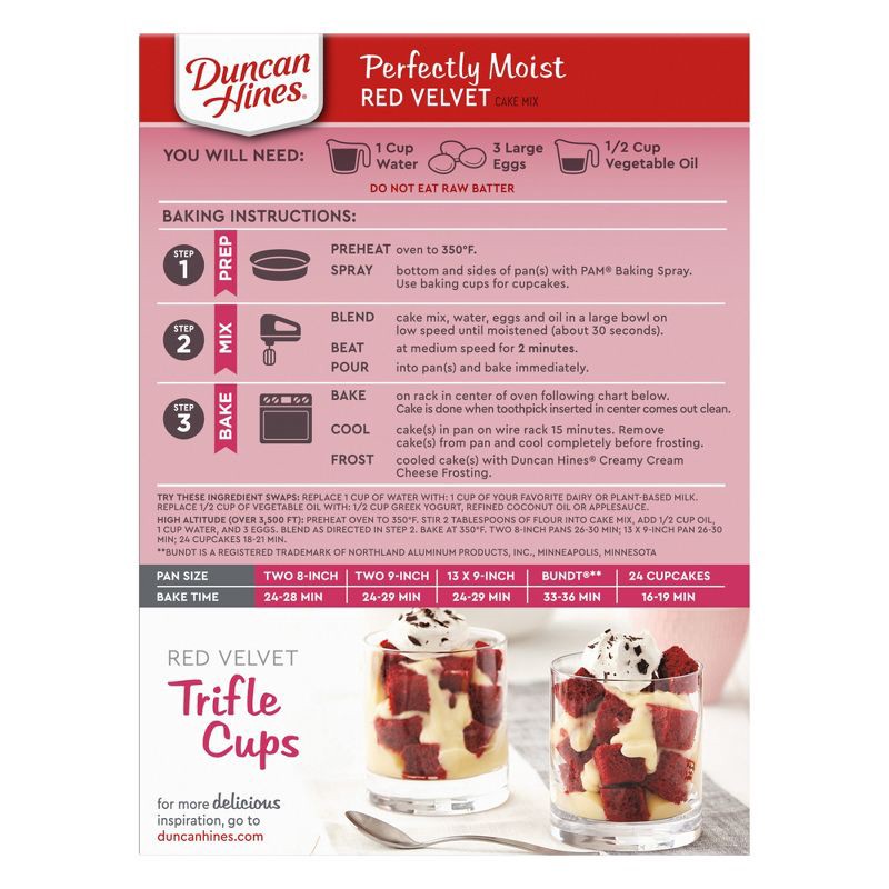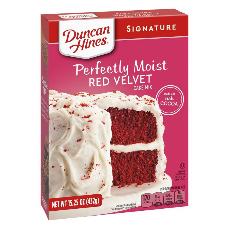 - One 15.25 oz box of Duncan Hines Perfectly Moist Red Velvet Cake Mix