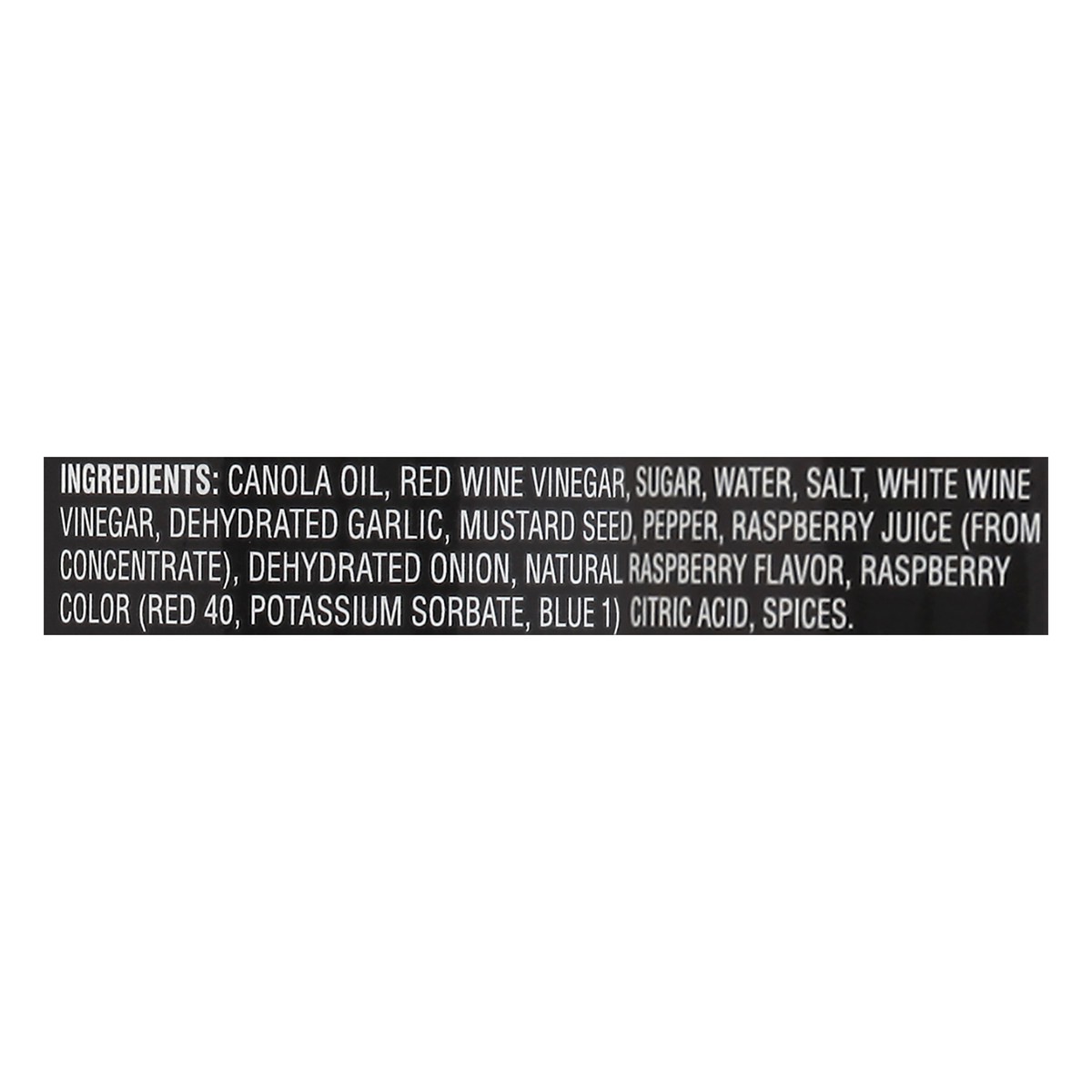 Canola Oil, Red Wine Vinegar, Sugar, Water, Salt, White Wine Vinegar, Dehydrated Garlic, Mustard Seed, Pepper, Raspberry Juice (from Concentrate), Dehydrated Onion, Natural Raspberry Flavor, Raspberry…
