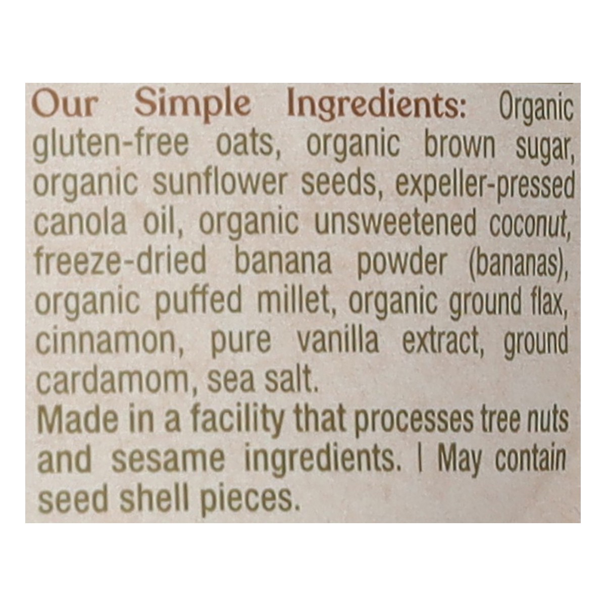 Our Simple Ingredients: Organic Gluten-Free Oats, Organic Brown Sugar, Organic Sunflower Seeds, Expeller-Pressed Canola Oil, Organic Unsweetened Coconut, Freeze-Dried Banana Powder (Bananas), Organic …