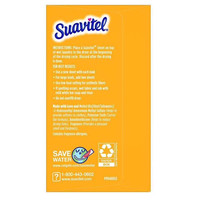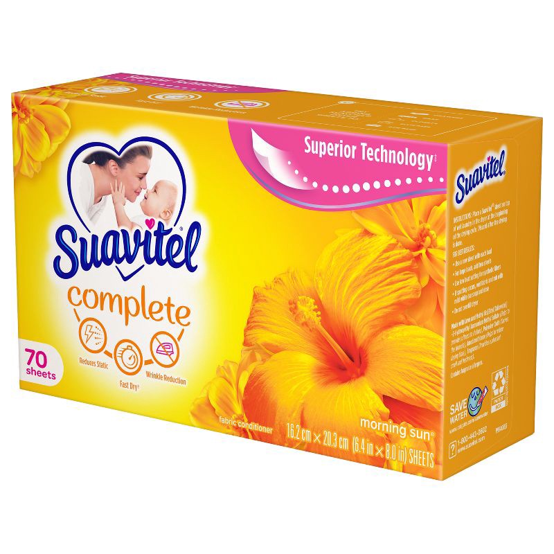 - One 70 count box of Suavitel Complete Dryer Sheets, Fabric Conditioner, Morning Sun Scent