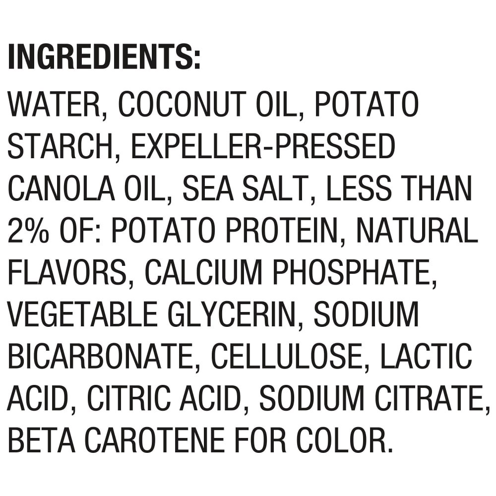 WATER, COCONUT OIL, POTATO STARCH, EXPELLER-PRESSED CANOLA OIL, SEA SALT, LESS THAN 2% OF: POTATO PROTEIN, NATURAL FLAVORS, CALCIUM PHOSPHATE, VEGETABLE GLYCERIN, SODIUM BICARBONATE, CELLULOSE, LACTIC…