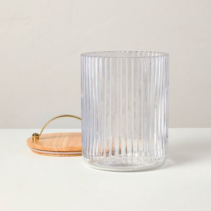 Organize your kitchen space with this Fluted Glass Storage Canister set with Wood Lid from Hearth & Hand™ with Magnolia. Made of fluted glass, this transparent canister has a ribbed texture that enhan…