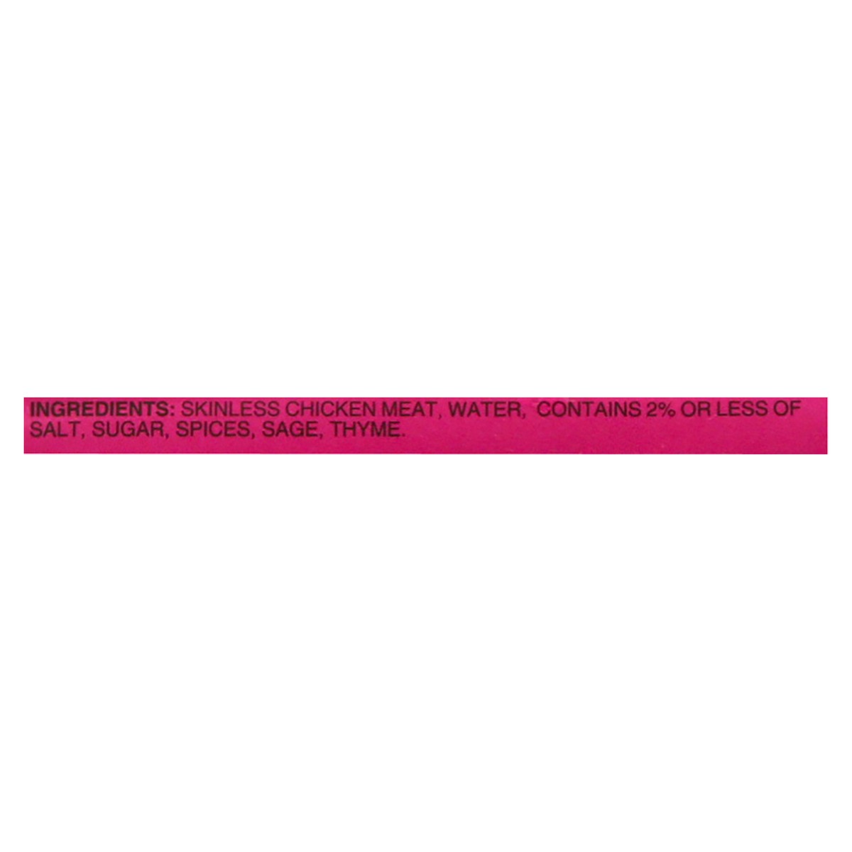 Skinless Chicken Meat, Water, Contains 2% or Less of Salt, Sugar, Spices, Sage, Thyme.