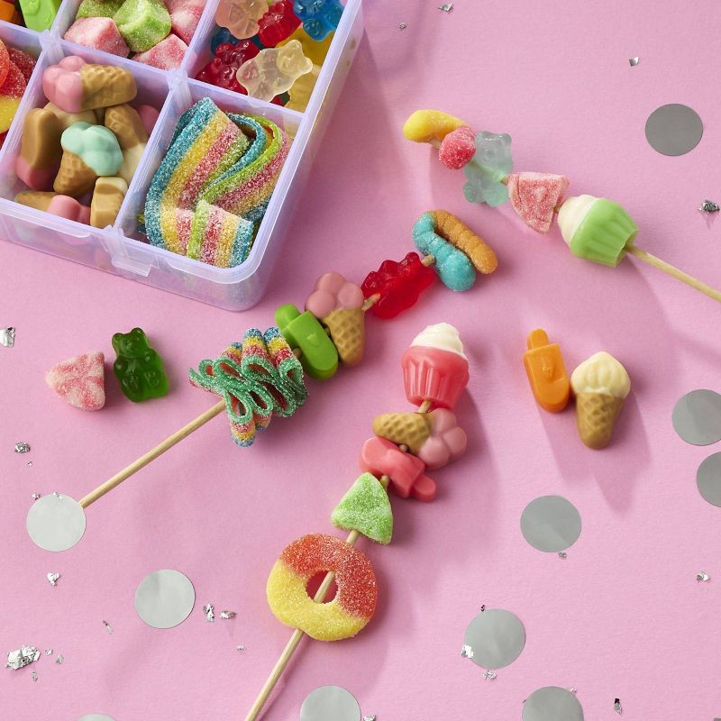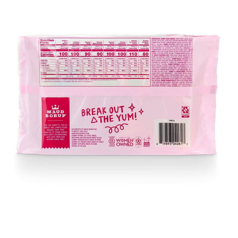 - Includes 8 gummy varieties: sour worms, ice pops, rings, watermelons, bears, cupcakes, ice cream cones & rainbow belts