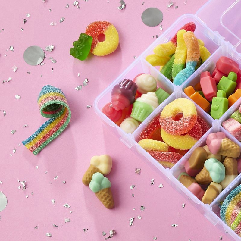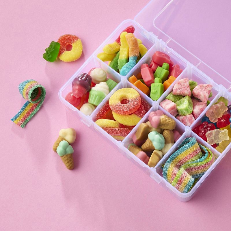 - 12.4 oz gummy assortment in a reusable tackle box style container