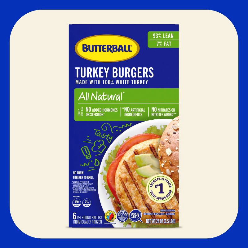 - Includes six 1/4 lb. Butterball All Natural White Frozen Turkey Burger Patties