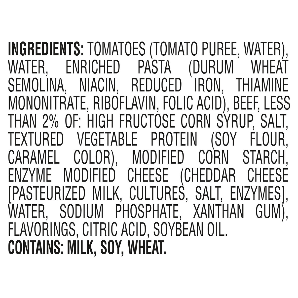 Tomatoes (Tomato Puree, Water), Water, Enriched Pasta (Durum Wheat Semolina, Niacin, Reduced Iron, Thiamine Mononitrate, Riboflavin, Folic Acid), Beef, Less than 2% of: High Fructose Corn Syrup, Salt,…