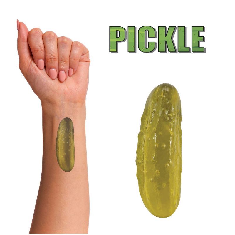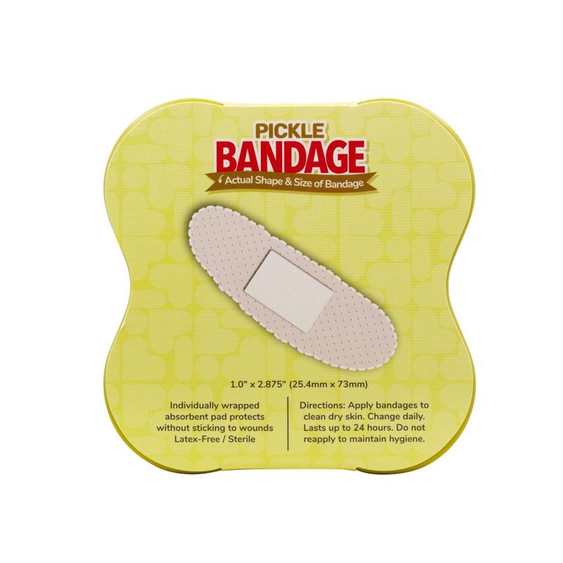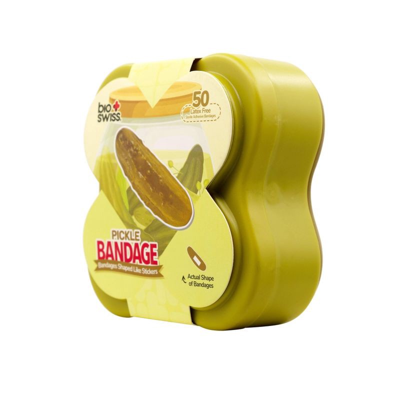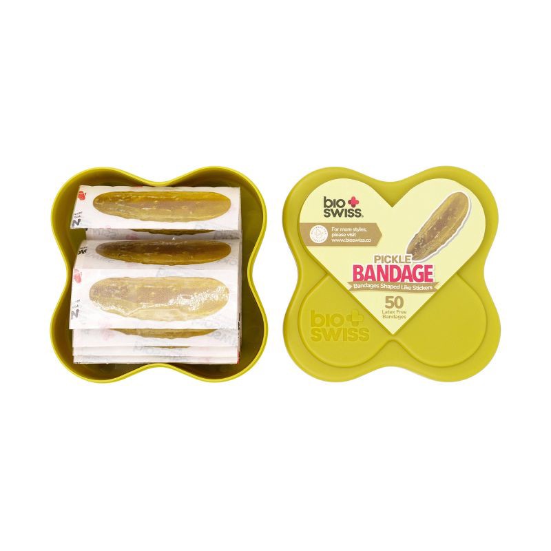 - 50 PICKLE-SHAPED BANDAGES: A fun and functional reusable collector's box of uniquely designed adhesive bandages that protect minor cuts, scrapes, and everyday skin irritations with a smile.