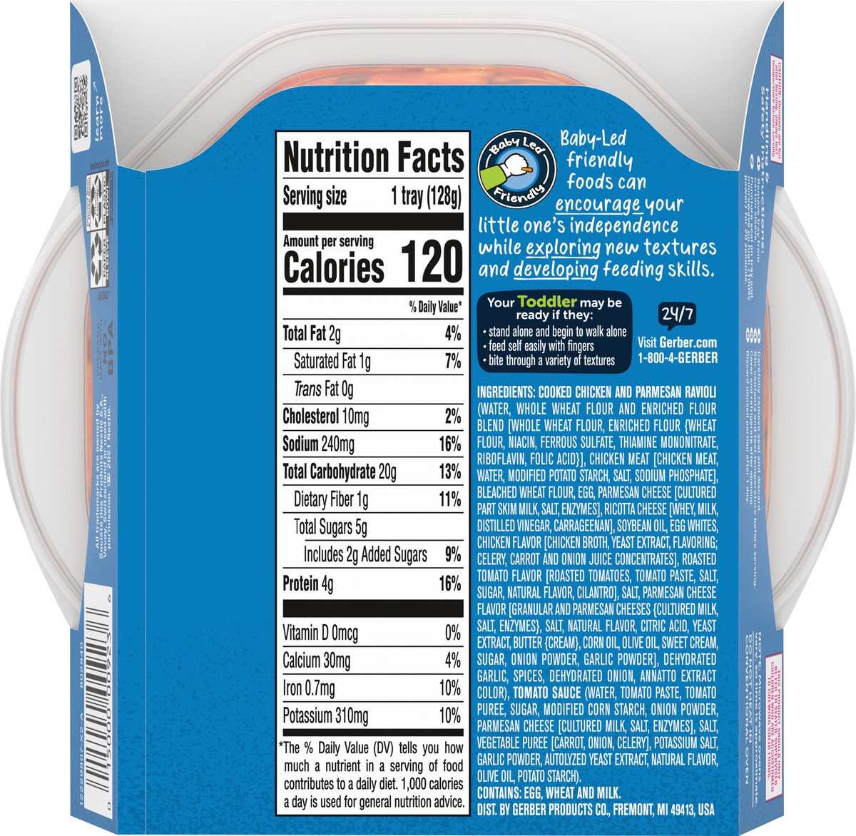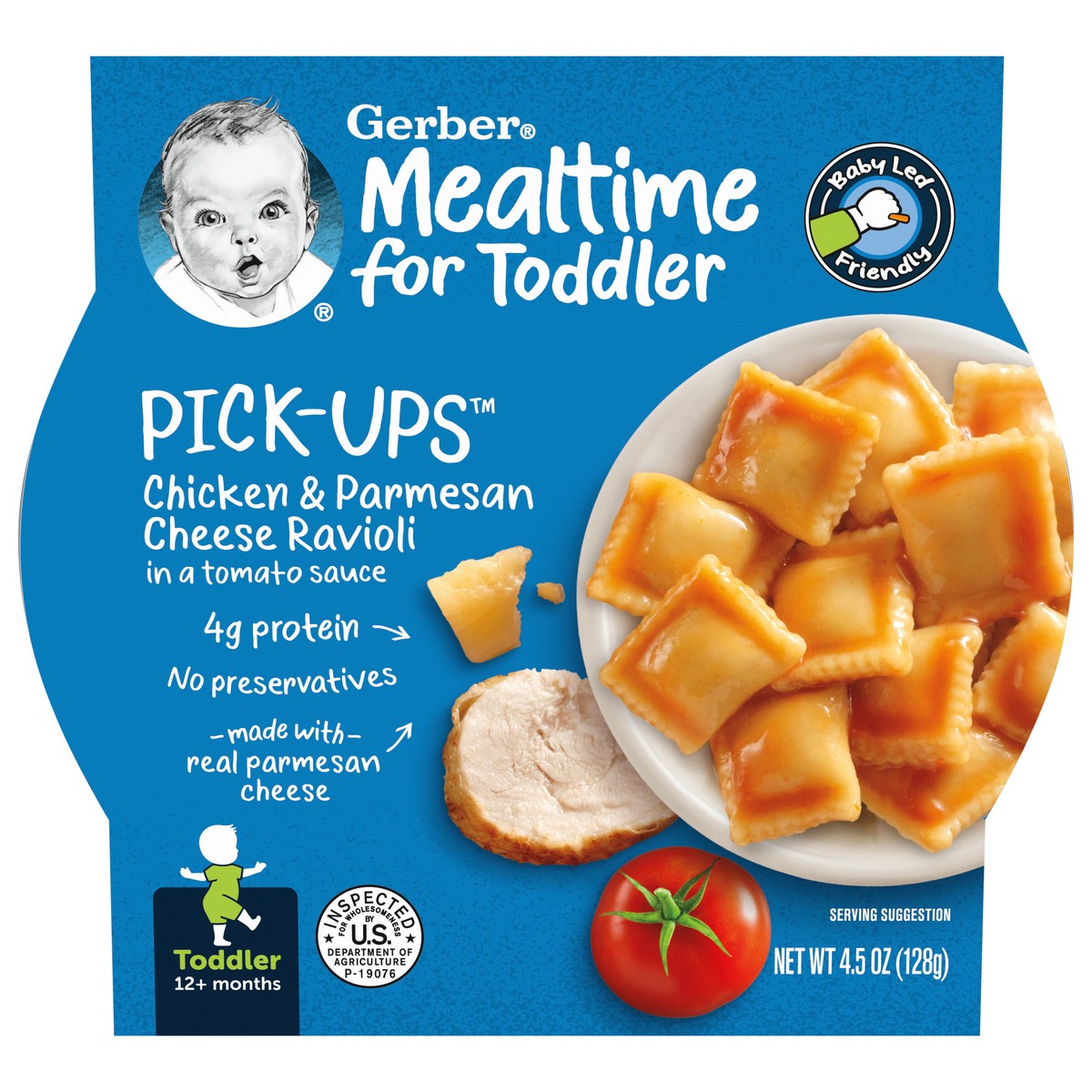 - 4.5 oz package of Gerber Pick-Ups Chicken and Parmesan Cheese Ravioli in Tomato Sauce Toddler Meals
