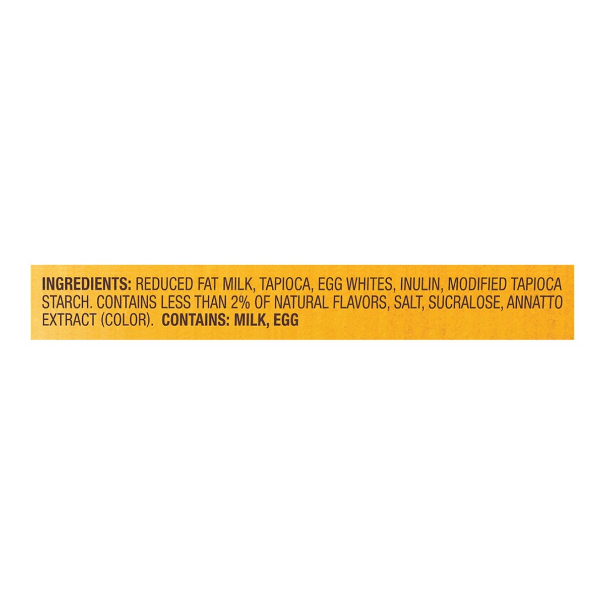 Reduced Fat Milk, Tapioca, Egg Whites, Inulin, Modified Tapioca Starch, Contains Less than 2% of Natural Flavors, Salt, Sucralose, Annatto Extract (Color).