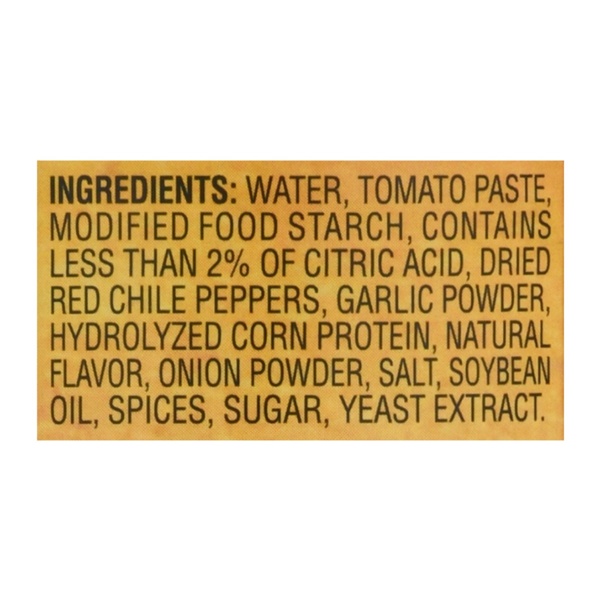 Water, Tomato Paste, Modified Food Starch, Contains Less than 2% of Citric Acid, Dried Red Chile Peppers, Garlic Powder, Hydrolyzed Corn Protein, Natural Flavor, Onion Powder, Salt, Soybean Oil, Spice…