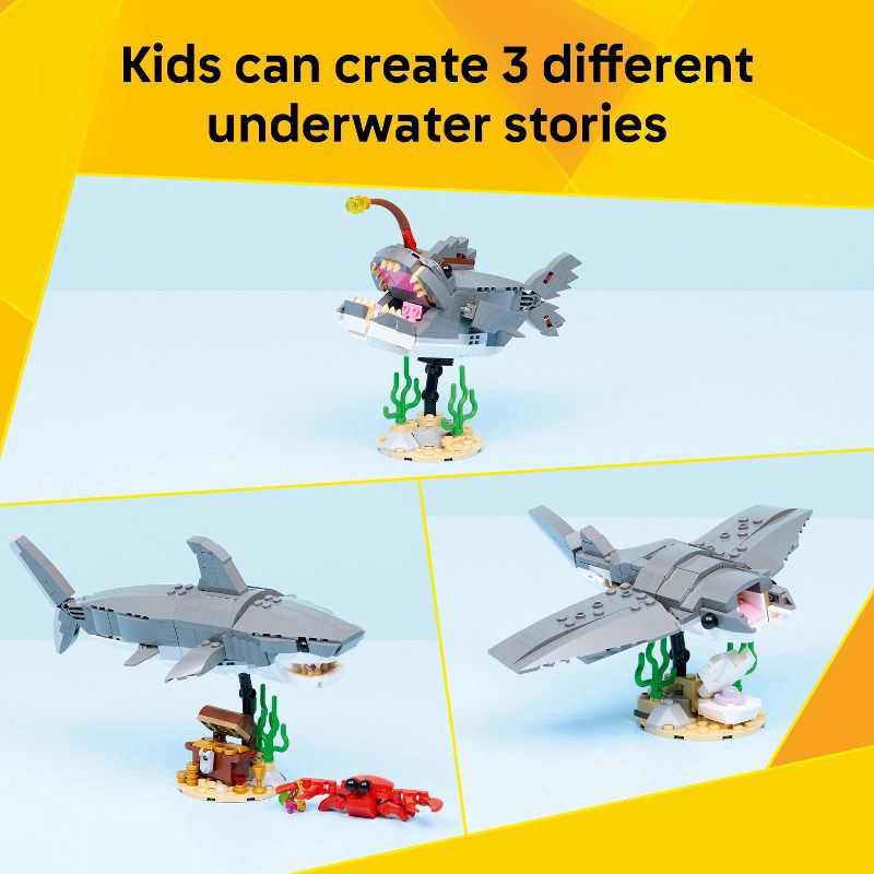 - 3 IN 1 TOY FOR KIDS – LEGO Creator 3 in 1 Fierce Shark with a Treasure Chest (31381) building toy lets boys and girls ages 8 years old and up construct 3 shark and sea animal toys from 1 set of LEGO bricks