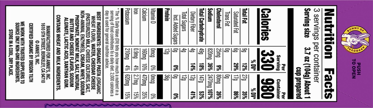 Best Ingredients: Organic Pasta (Organic Wheat Flour), Water, Cheddar Cheese (Pasteurized Milk, Cheese Cultures, Salt, Non-Animal Enzymes), Cream, Whey, Sodium Phosphate, Nonfat Milk, Salt, Natural Bu…
