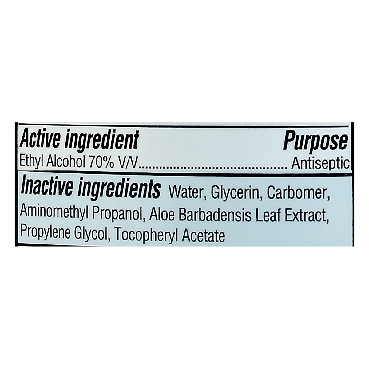 Active Ingredients: Ethyl Alcohol v/v (70 %), Antiseptic. Inactive Ingredients: Water, Glycerin, Carbomer, Aminomethyl Propanol, Aloe Barbadensis Leaf Extract, Propylene Glycol, Tocopheryl Acetate.