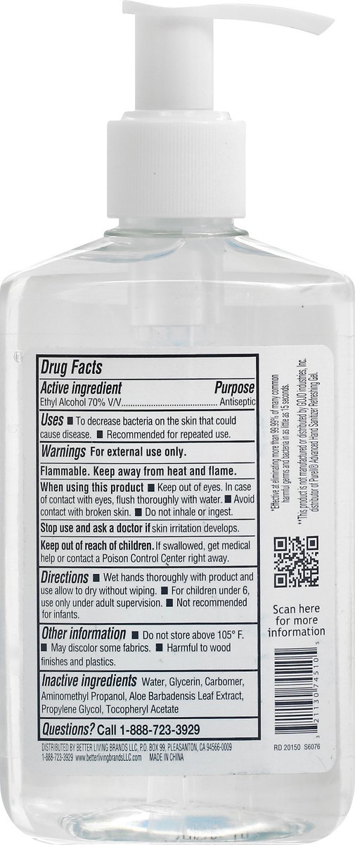 Other Information: Do not store above 105 degrees F. May discolor some fabrics. Harmful to wood finishes and plastics. Compared to Purell advanced hand sanitizing refreshing gel (This product is not m…