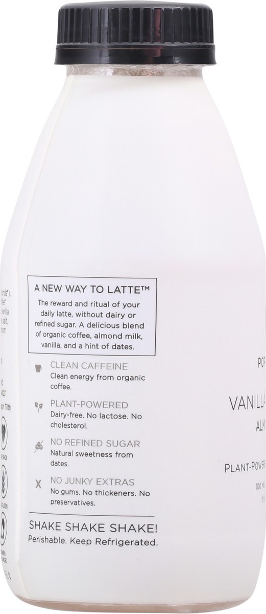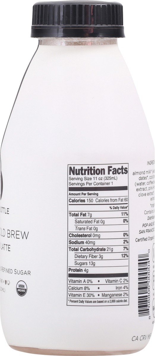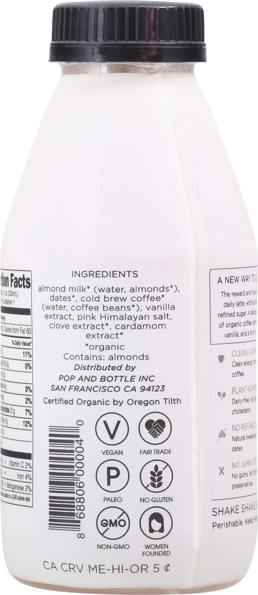 Almond Milk* (Water, Almonds*), Dates*, Cold Brew Coffee* (Water, Coffee Beans*), Vanilla Extract*, Himalayan Pink Salt, Clove Extract*, Cardamom Extract*. * Organic.