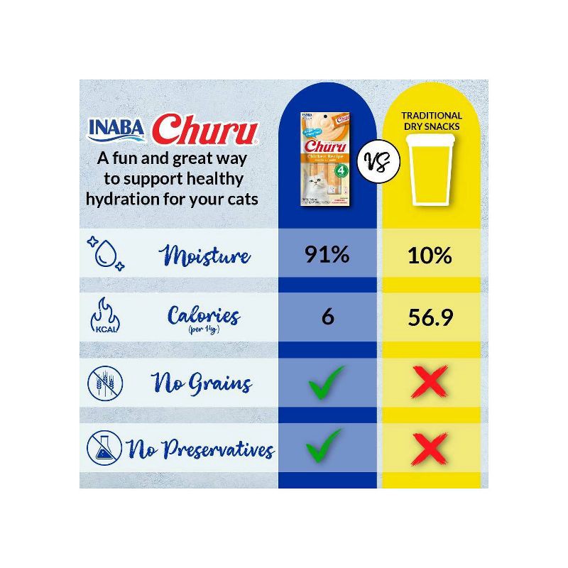 - KEEP YOUR FELINE HYDRATED WITHOUT ADDING CALORIES: Each delicious, creamy Churu tube contains 91% moisture and only 6 calories (a tenth of the calories of traditional dry cat treats), which makes it a healthy snack you can feel good about feeding