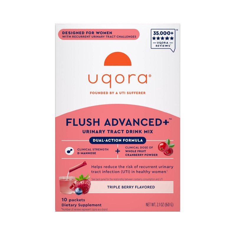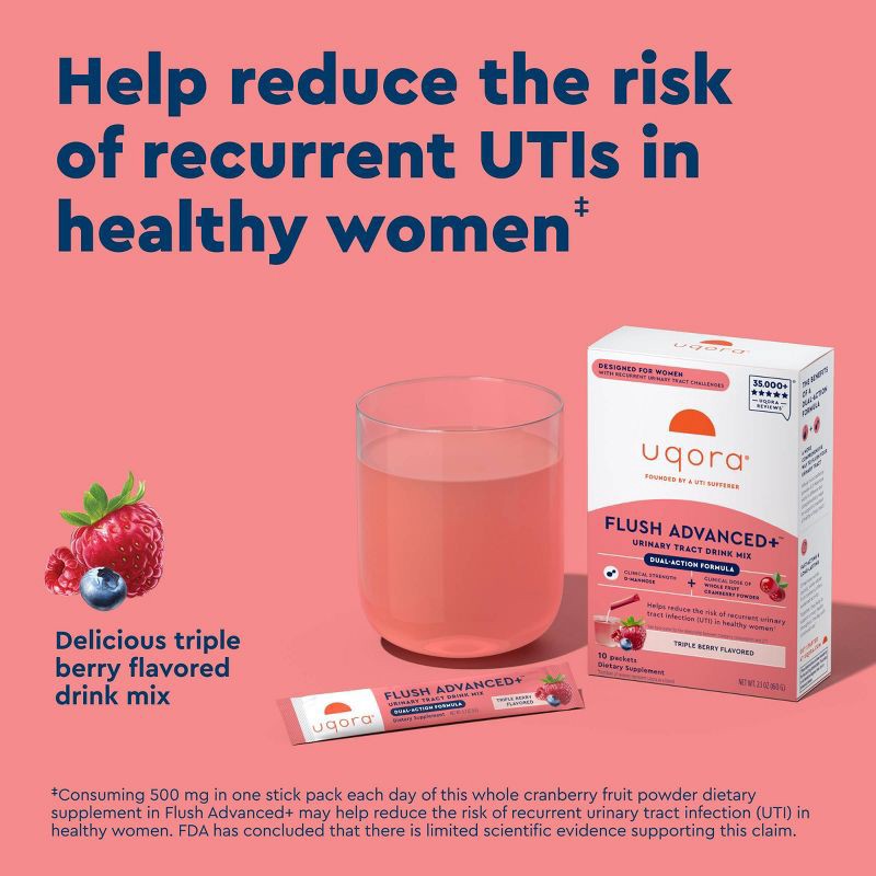 - Formula With Clinically Supported Cranberry: Uqora Flush Advanced+ is formulated to help reduce the risk of recurrent urinary tract infections in healthy women with a clinical dose of whole-fruit cranberry powder (equal to 15 fresh cranberries)**