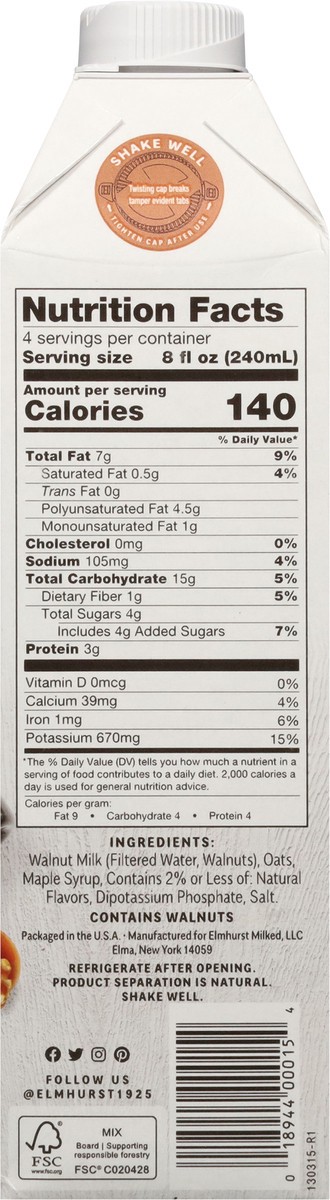 Walnut Milk (Filtered Water, Walnuts), Oats, Maple Syrup, Contains 2% or Less of: Natural Flavors, Dipotassium Phosphate, Salt.