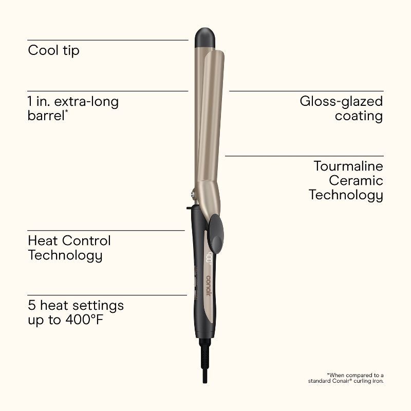 Features: Instant Heat, Swivel cord, Adjustable Temperature Range, 6' Professional Length Cord, Long Curling Barrel, Cool Tip, Ceramic Barrel, Ionic, Digital Controls, Multiple Heat Settings