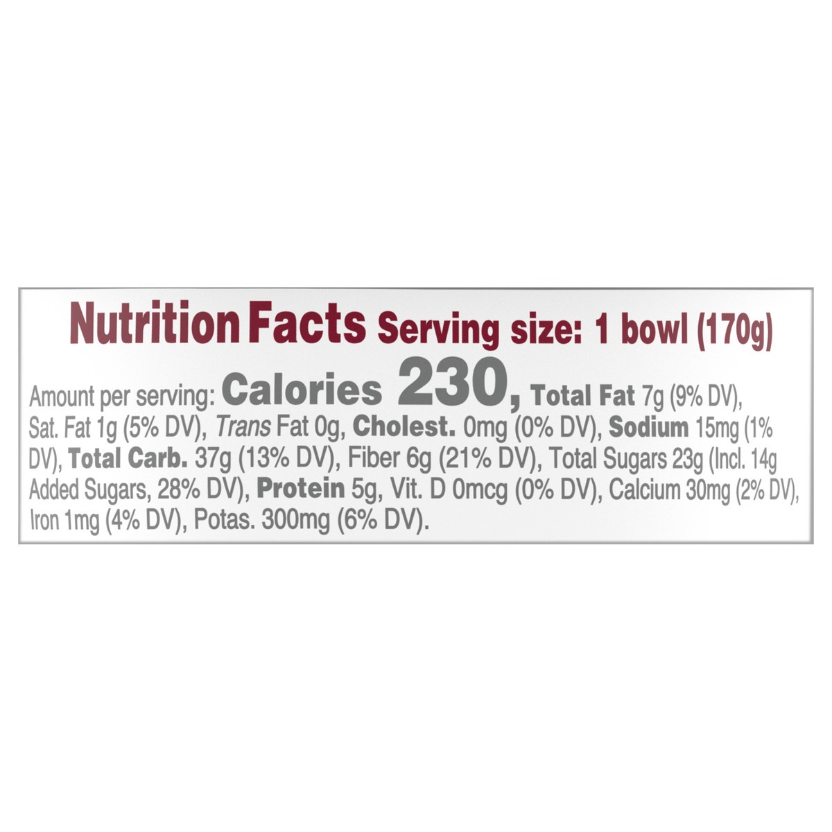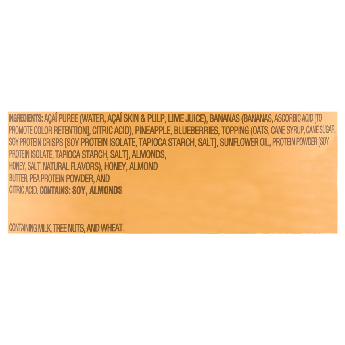 Acai Puree (Water, Acai Skin & Pulp, Lime Juice), Bananas (Bananas, Ascorbic Acid [to Promote Color Retention], Citric Acid), Pineapple, Blueberries, Topping (Oats, Cane Syrup, Cane Sugar, Soy Protein…
