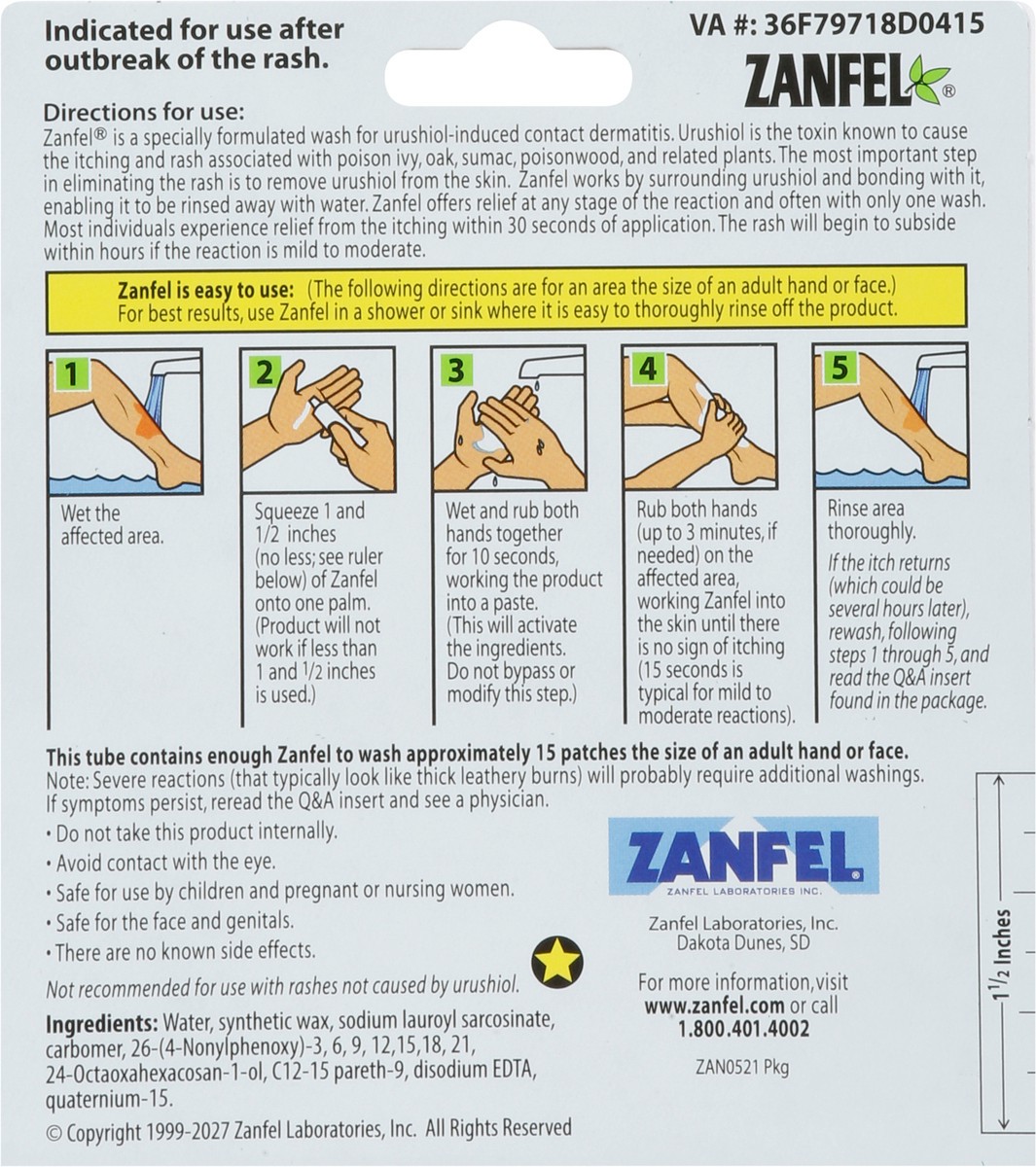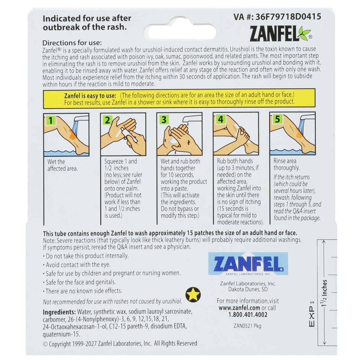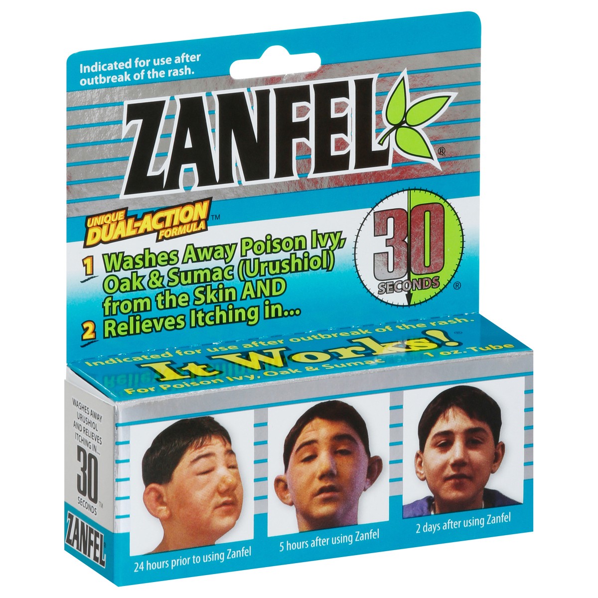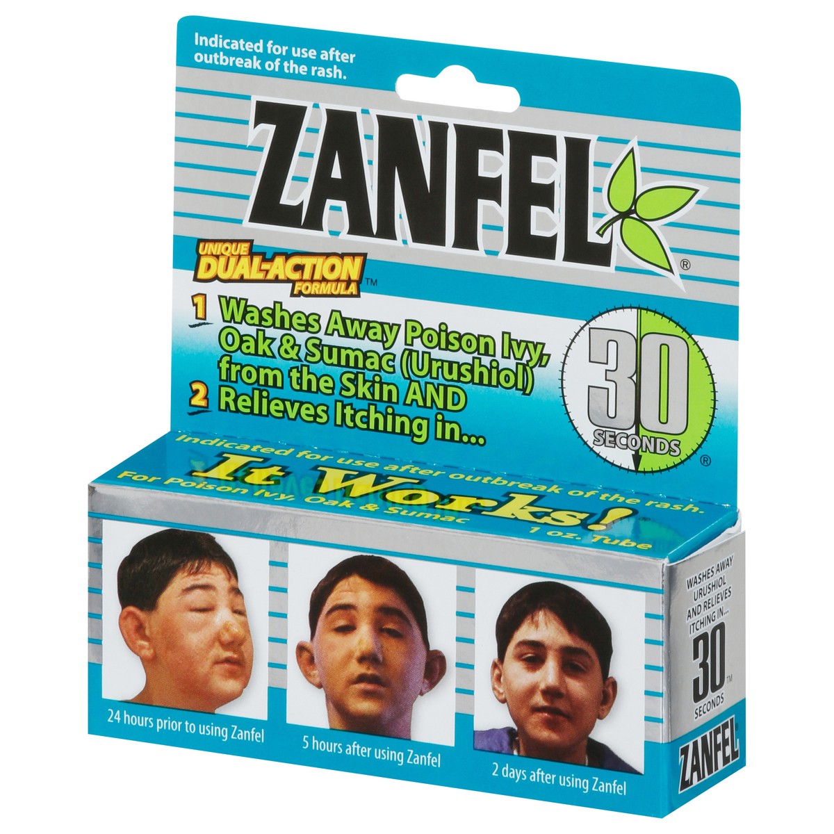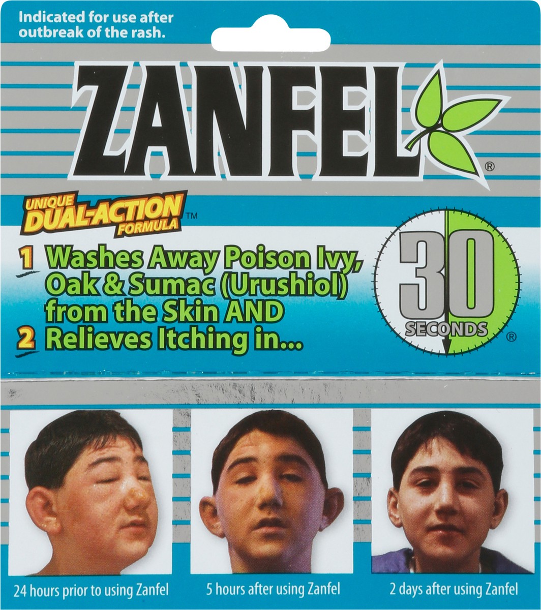 Unique dual-action formula. 1. Washes away poison ivy, oak & sumac (urushiol) from the skin and 2. Relieves itching in. 30 seconds. 24 hours prior to using Zanfel. 5 hours after using Zanfel. 2 days a…