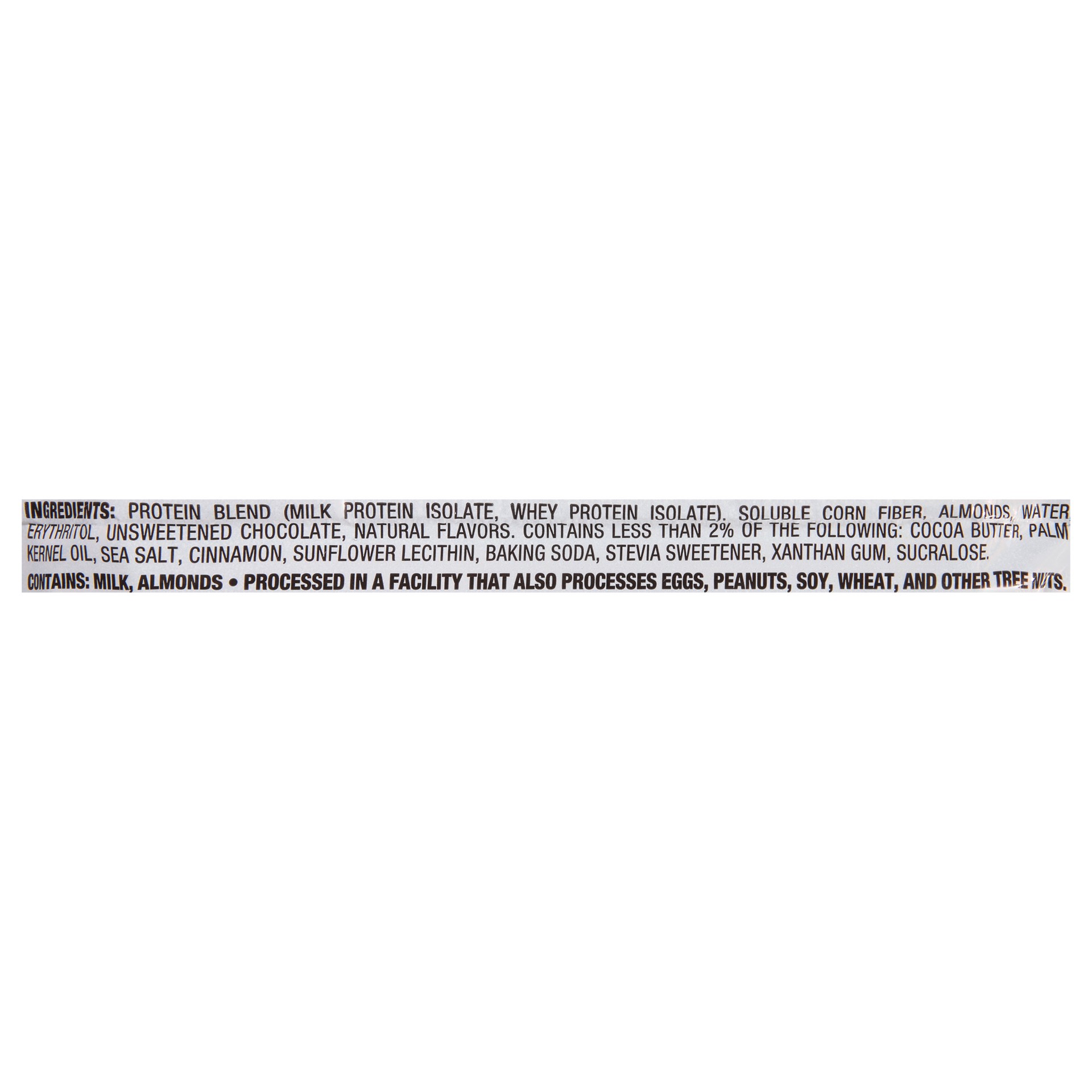 Protein Blend (Milk Protein Isolate, Whey Protein Isolate), Soluble Corn Fiber, Almonds, Water Erythritol, Unsweetened Chocolate, Natural Flavors, Contains Less than 2% of the Following: Cocoa Butter,…