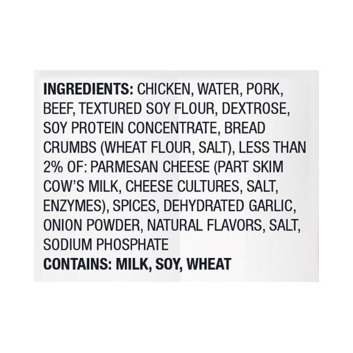Chicken, Water, Pork, Beef, Textured Soy Flour, Dextrose, Soy Protein Concentrate, Bread Crumbs (Wheat Flour, Salt), Less than 2% of: Parmesan Cheese (Part Skim Cow's Milk, Cheese Cultures, Salt, Enzy…