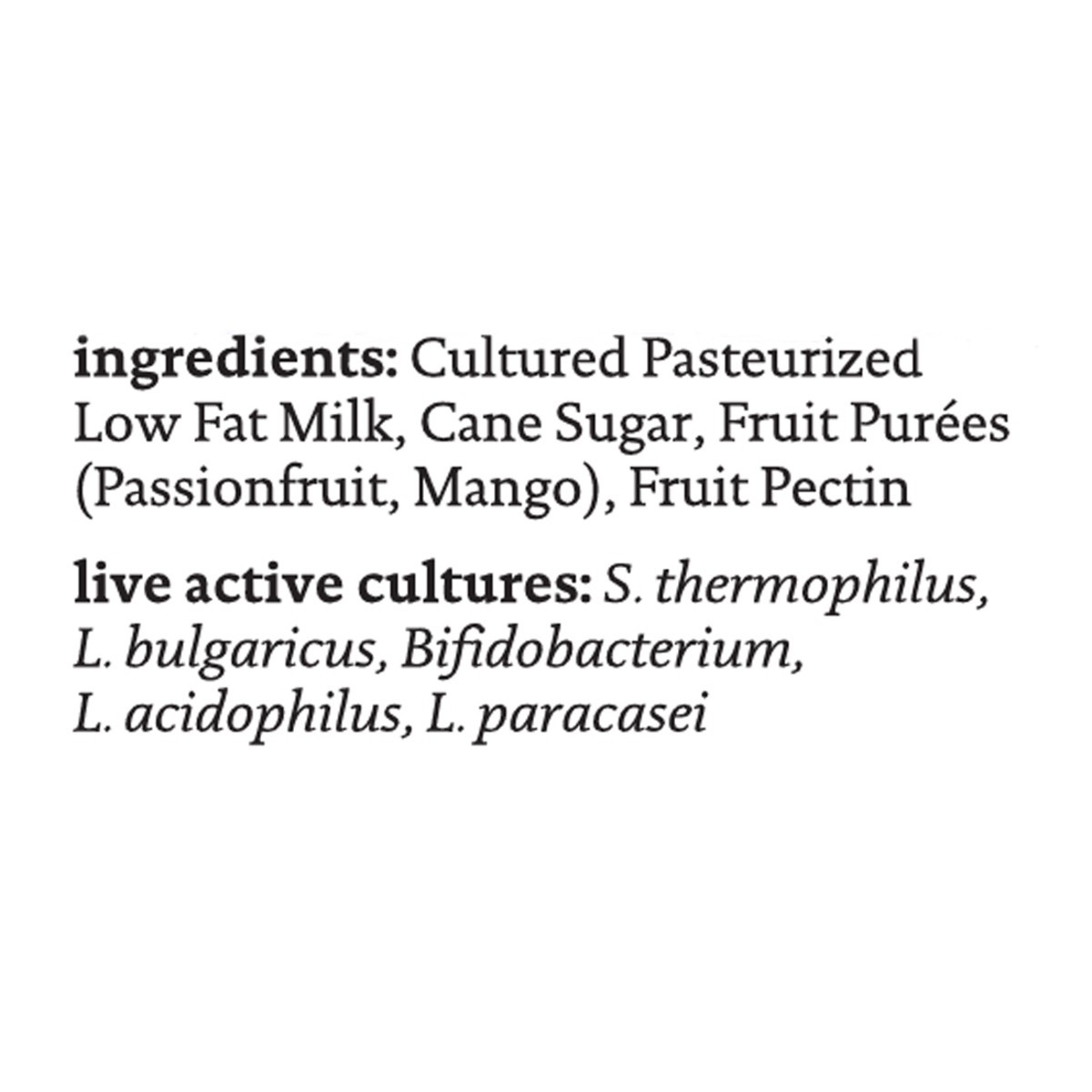 Cultured Pasteurized Low Fat Milk, Cane Sugar, Fruit Purees (Passionfruit, Mango), Fruit Pectin Live Active Cultures: S. Thermophilus, L. Bulgaricus, Bifidobacterium, L. Acidophilus, L, Paracasei.